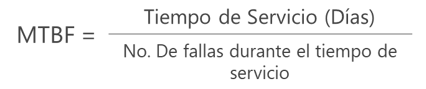 Ejemplo de cálculo: Tomando como referencia los dispositivos de sellado comentados anteriormente, los cuales han estado en servicio durante 5 años o 1825 días, con un número de 4 fallas en ese mismo periodo podríamos determinar el MTBF (tiempo medio entre fallas), el cual se calcularía de la siguiente manera: